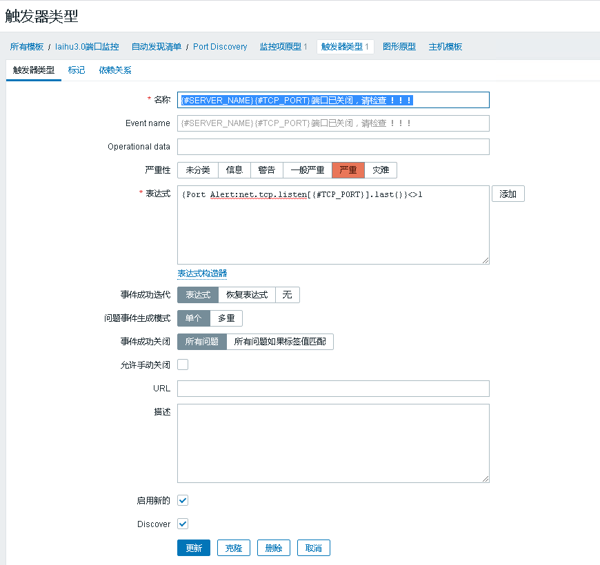 表达式:{Port Alert:net.tcp.listen[{#TCP_PORT}].last()}<>1