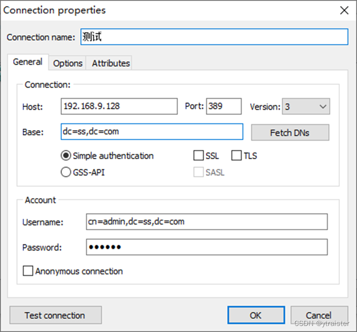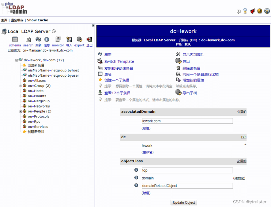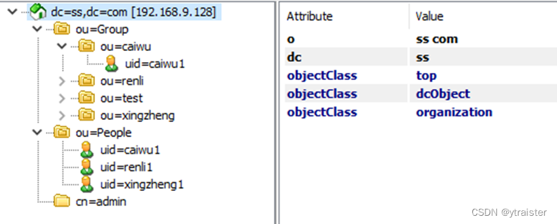 ## LDAP配置与安装 [news](http://wed.xjx100.cn/news.html)/2023/9/12 8:49:38 ### LDAP配置与安装 - 一、安装LDAP - - 1、安装OpenLDAP及相关依赖包 - 2、查看OpenLDAP版本 - 3、配置OpenLDAP数据库 - 4、设置OpenLDAP的管理员密码 - 5、修改配置文件 - - 5.1. 修改{2}hdb.ldif文件 - 5.2. 修改{1}monitor.ldif文件 - 5.3. 修改{-1}frontend.ldif文件 - 6、验证LDAP的基本配置 - 7、修改LDAP文件权限、端口(不强求) - 8、启动OpenLDAP服务 - 9、导入基本Schema - 10、修改migrate\_common.ph文件 - 11、配置LDAP基础数据库 - 12、导入基础数据库 - 13、添加用户及用户组 - 14、查询LDAP的相关信息 - 15、开启OpenLDAP日志访问功能 - 二、安装PHPldapAdmin管理软件 - - 1、安装 - 2、修改配置文件 - 3、启动httpd - 三、使用LdapAdmin - 四、数据迁移 - - 1、获取数据到指定文件 - 2、查看数据是否备份成功 - 3、插入数据 - 五、卸载LDAP - 参考 # 一、安装LDAP ## 1、安装OpenLDAP及相关依赖包 ``` [root@nano ~]# yum -y install openldap compat-openldap openldap-clients openldap-servers openldap-servers-sql openldap-devel migrationtools ``` ## 2、查看OpenLDAP版本 ``` [root@nano ~]# slapd -VV ``` ## 3、配置OpenLDAP数据库 ``` # OpenLDAP默认使用的数据库是BerkeleyDB,/var/lib/ldap/就是BerkeleyDB数据库默认存储的路径: [root@localhost cn=config]# cp /usr/share/openldap-servers/DB_CONFIG.example /var/lib/ldap/DB_CONFIG ``` ## 4、设置OpenLDAP的管理员密码 > (格式——slappasswd -s \[password\]) ``` [root@nano ~]# slappasswd -s huawei {SSHA}TlGs09uMOeFa5UJNhy1LB6cGW9i8N+tt # 记住该密码,下面配置要用 ``` ## 5、修改配置文件 定位到/etc/openldap/slapd.d/cn=config中,修改相关配置文件{1}monitor.ldif、{2}hdb.ldif、{-1}frontend.ldif: ``` [root@nano ~]# cd /etc/openldap/slapd.d/cn\=config [root@nano cn=config]# ll > 总用量 24 drwxr-x---. 2 ldap 4096 3月 2 10:14 cn=schema > -rw-------. 1 ldap 378 3月 2 10:14 cn=schema.ldif > -rw-------. 1 ldap 513 3月 2 10:14 olcDatabase={0}config.ldif > -rw-------. 1 ldap ldap 443 3月 2 10:14 olcDatabase={-1}frontend.ldif > -rw-------. 1 ldap ldap 562 3月 2 10:14 olcDatabase={1}monitor.ldif > -rw-------. 1 ldap ldap 609 3月 2 10:14 olcDatabase={2}hdb.ldif ``` ### 5.1. 修改{2}hdb.ldif文件 ``` [root@nano cn=config]# vim olcDatabase\=\{2\}hdb.ldif ```  > - 修改域信息: olcSuffix: dc=ss,dc=com olcRootDN: cn=admin,dc=ss,dc=com > - 定位到最后添加一行密码: olcRootPW: {SSHA}dXgO/Ipy5SQiKFZ0u7m79Xo7uzKIr038 > - 注意:其中cn=admin中的admin表示OpenLDAP管理员的用户名,dc为ldap的服务器域名(dc=ss是自行创建的服务器域名),olcRootPW表示OpenLDAP管理员的密码 ### 5.2. 修改{1}monitor.ldif文件 ``` [root@nano cn=config]# vim olcDatabase\=\{1\}monitor.ldif ```  ### 5.3. 修改{-1}frontend.ldif文件 ``` [root@localhost cn=config]# vim olcDatabase\=\{-1\}frontend.ldif # 权限设置,指定用户密码只能由本人和管理员能更改。添加如下两行代码:olcAccess: {0}to attrs=userPassword by self write by anonymous auth by users noneolcAccess: {1}to * by * read ``` ## 6、验证LDAP的基本配置 ``` # 若出现succeeded就表示成功了 [root@nano cn=config]# slaptest -u ``` ## 7、修改LDAP文件权限、端口(不强求) ``` [root@localhost cn=config]# chown -R ldap:ldap /var/lib/ldap/ [root@localhost cn=config]# chown -R ldap:ldap /etc/openldap/# OpenLDAP默认监听的端口是389,我们可在/etc/sysconfig/slapd文件中修改其监听端口,如下修改为4567端口 [root@localhost cn=config]# vim /etc/sysconfig/slapd SLAPD_URLS= "ldapi://0.0.0.0:4567/ldap://0.0.0.0:4567/" ``` ## 8、启动OpenLDAP服务 ``` [root@localhost cn=config]# systemctl enable --now slapd # 设置slapd服务开机自启,并启动# 验证端口状态 # 前提是要安装net-tools才能使用netstat命令 [root@localhost cn=config]# netstat -antup | grep 389 ```  ## 9、导入基本Schema 导入基本Schema,使用如下命令: ``` [root@nano cn=config]# ldapadd -Y EXTERNAL -H ldapi:/// -f /etc/openldap/schema/cosine.ldif [root@nano cn=config]# ldapadd -Y EXTERNAL -H ldapi:/// -f /etc/openldap/schema/nis.ldif [root@nano cn=config]# ldapadd -Y EXTERNAL -H ldapi:/// -f /etc/openldap/schema/inetorgperson.ldif ``` ## 10、修改migrate\_common.ph文件 ``` # migrate_common.ph文件主要是用于生成ldif文件使用,修改migrate_common.ph文件,如下: [root@localhost cn=config]# vim /usr/share/migrationtools/migrate_common.ph +71 ```  ## 11、配置LDAP基础数据库 ``` # 配置如下信息(修改对应的dc数据值): [root@localhost ~]# mkdir /root/openldap [root@localhost ~]# vim openldap/base.ldif #管理员信息 dn: dc=ss,dc=com o: ss com dc: ss objectClass: top objectClass: dcObject objectclass: organizationdn: cn=admin,dc=ss,dc=com cn: admin objectClass: organizationalRole description: Directory Manager#基本分组 dn: ou=People,dc=ss,dc=com ou: People objectClass: top objectClass: organizationalUnitdn: ou=Group,dc=ss,dc=com ou: Group objectClass: top objectClass: organizationalUnit ``` ## 12、导入基础数据库 ``` # -x 进行简单认证、-D 用来绑定服务器的DN、-w 绑定管理员的密码(最开始设置的) [root@localhost ~]# ldapadd -x -D 'cn=admin,dc=ss,dc=com' -w '123456' -f /root/openldap/base.ldif ``` ## 13、添加用户及用户组 默认情况下OpenLDAP是没有普通用户的,只有一个管理员用户(最开始配置的) ``` [root@localhost ~]# groupadd ldapgroup1 [root@localhost ~]# groupadd ldapgroup2 [root@localhost ~]# useradd -g ldapgroup1 ldapuser1 [root@localhost ~]# useradd -g ldapgroup2 ldapuser2 [root@localhost ~]# echo '123456' | passwd --stdin ldapuser1 [root@localhost ~]# echo '123456' | passwd --stdin ldapuser2# 提取刚添加的用户和用户组相关信息 [root@localhost ~]# grep ":10[0-9][0-9]" /etc/passwd > /root/openldap/users [root@localhost ~]# grep ":10[0-9][0-9]"