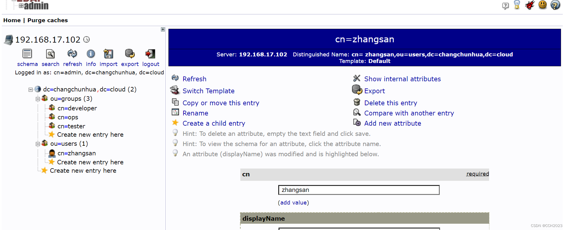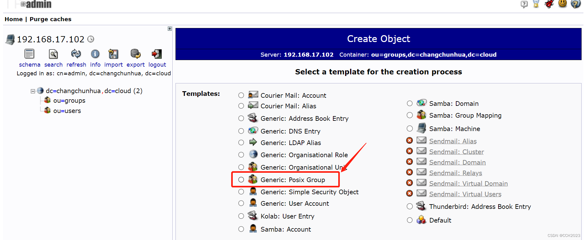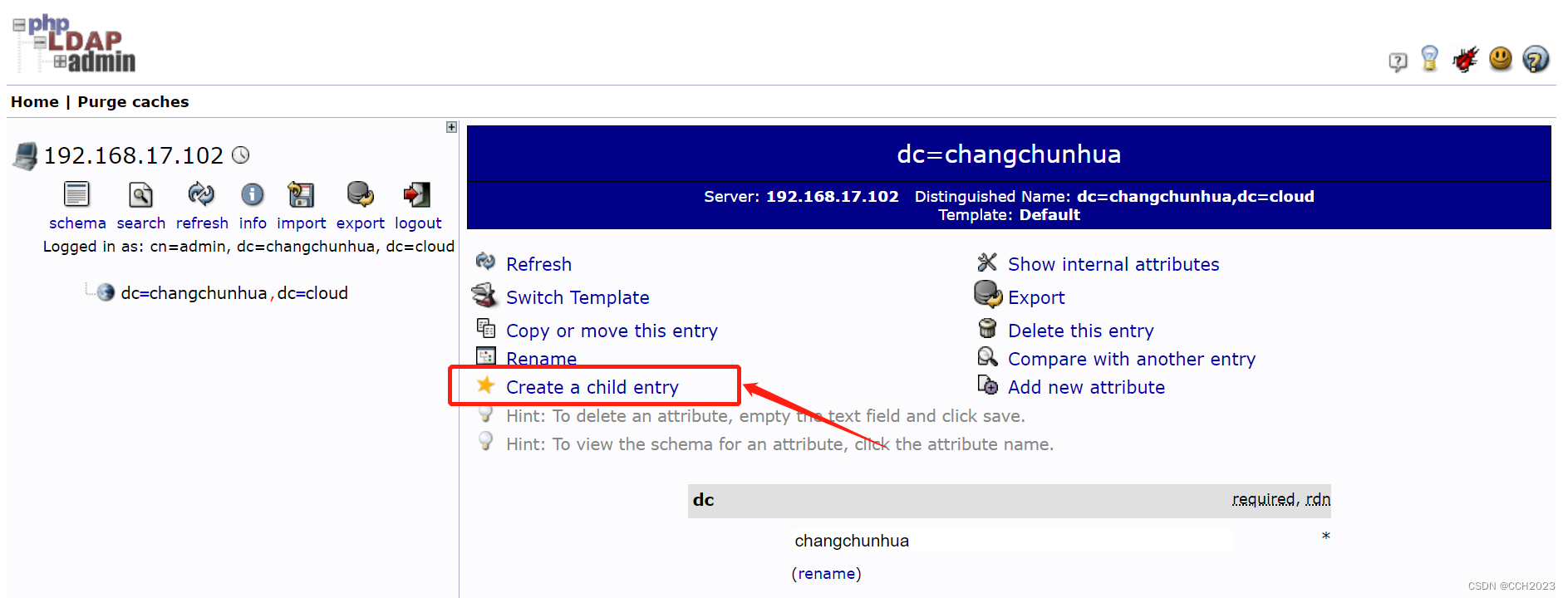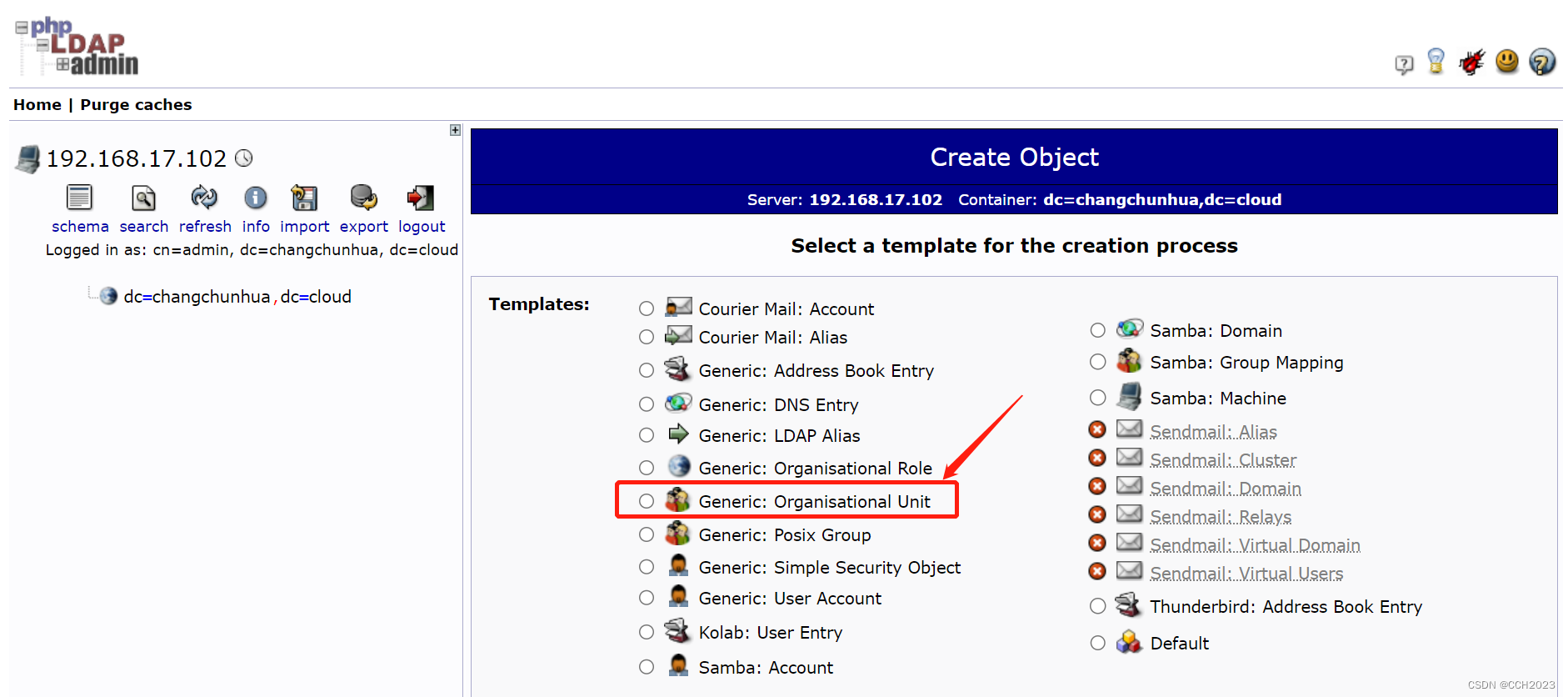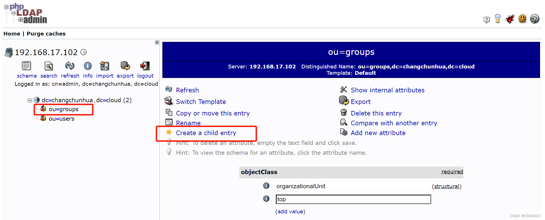 1、[LDAP](https://so.csdn.net/so/search?q=LDAP&spm=1001.2101.3001.7020)概念: LDAP是轻量级目录访问协议,英文全称是:LightWeight Directory Access Protocol,一般称为LDAP。 按照我们对文件目录的理解,LDAP可以看成是一个文件系统,类似目录和文件树。 2、LDAP软件: LDAP是一个协议。 LDAP产品:Microsoft的ActiveDrectory,Lotus的Domino Directory、[IBM](https://so.csdn.net/so/search?q=IBM&spm=1001.2101.3001.7020)的WebSphere中也集成了LDAP服务。 LDAP的开源实现是OpenLDAP。 3、OpenLDAP介绍: OpenLDAP是最常用的目录服务之一,提供了目录服务的所有功能,包括目录搜索,身份认证、安全通道、过滤器等。 大多数的Linux发行版里面都带有OpenLDAP的安装包。 OpenLDAP服务默认是使用非加密的TCP/IP协议来接收服务的请求,并将查询结果传到客户端。 由于大多数目录服务都是用于系统的安全认证部分比如:用户登录和身份验证,所以它也支持使用基于SSL/TLS的加密协议来保证数据传送的保密性和完整性。 OpenLDAP是使用的OpenSSL来实现SSL/TLS的加密通信的。 4、LDAP的信息模型: LDAP的信息模型是建立在目录entries的基础上。 一个条目是一些属性的集合,并且具有一个全局唯一性的可区分名称DN, 一个条目可以通过DN来引用。 每一个条目的属性具有一个类型和一个或多个值。 类型通常是容易记忆的名称,比如cn是通用名称common name,或者mail是电子邮件。 条目的值的语法取决于属性类型。比如cn属性可能具有一个值“Babs Jensen”。 一个mail属性可能包括"test@123.com” 5、LDAP的objectClass LDAP通过属性objectClass来控制哪一个属性必须出现或允许出现在一个条目中,它的值决定了该条目必须遵守的模式规则。可以理解为关系数据库的表结构。  6、LDAP的常用关键字: LDAP的entry是由各种字段构成,可以理解为关系数据库的字段。  7、OpenLDAP的部署: 7.1 拉取相关镜像: ``` docker pull osixia/openldap docker pull osixia/phpldapadmin ``` 7.2 运行容器openldap: ``` docker run -d -p 389:389 -p 636:636 -v /usr/local/ldap:/usr/local/ldap -v /data/openldap/ldap:/var/lib/ldap -v /data/openldap/slapd.d:/etc/ldap/slapd.d --env LDAP_ORGANISATION="changchunhua" --env LDAP_DOMAIN="changchunhua.cloud" --env LDAP_ADMIN_PASSWORD="123456" --name openldap --hostname openldap-host --network bridge osixia/openldap ``` \-v /data/openldap/ldap:/var/lib/ldap:将数据持久化到本地 \-p 389:389 \\ TCP/IP 访问端口,-p 636:636 \\ SSL 连接端口。 –name your\_ldap 自行设置容器名称 –network bridge 连接默认的 bridge 网络(docker0) –hostname openldap-host 设置容器主机名称为 openldap-host –env LDAP\_ORGANISATION=“changchunhua” 配置 LDAP 组织名称 –env LDAP\_DOMAIN=“changchunhua.cloud” 配置 LDAP 域名 –env LDAP\_ADMIN\_PASSWORD=“123456” 配置 LDAP 密码 默认登录用户名:admin 7.3 运行容器phpldapadmin: ``` docker run -p 8080:80 --privileged --name phpldapadmin --env PHPLDAPADMIN_HTTPS=false --env PHPLDAPADMIN_LDAP_HOSTS=192.168.17.102 --detach osixia/phpldapadmin ``` –privileged 特权模式启动(使用该参数,container 内的 root 拥有真正的 root 权限。 否则,container 内的 root 只是外部的一个普通用户权限。) –env PHPLDAPADMIN\_HTTPS=false 禁用 HTTPS –env PHPLDAPADMIN\_LDAP\_HOSTS =192.168.17.102 配置 openLDAP 的 IP 或者域名,我的 - openLDAP 是在虚拟机192.168.17.102启动。 此处设置访问端口为 8080,可自行更改访问端口号 可开启 443 端口 -p 443:443 7.4 浏览器访问http://192.168.17.102:8080:  输入登录: Login DN:cn=admin, dc=changchunhua, dc=cloud Password:123456  登录后的页面显示如下:  8、OpenLDAP用户创建: 创建OpenLDAP基础域: 第一步:点击dc=changchunhua,dc=cloud,然后点击Create a child entry:  第二步:点击 Generic:Organisational Unit: 创建groups: 同样的方式再创建users: 创建openldap组: