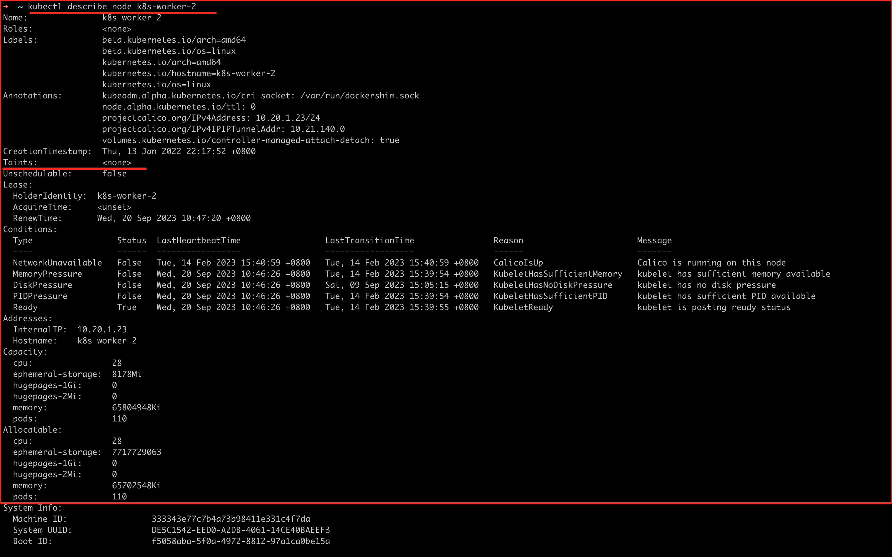 > 本文主要快速讲解Kubernetes的污点和容忍度,一句话总结:如果Pod能容忍某个节点上的污点,那么Pod就可以调度到该节点。 在K8S中,如果Pod能容忍某个节点上的污点,那么Pod就可以调度到该节点。如果不能容忍,那就无法调度到该节点。污点和容忍度就像谈恋爱的小情侣,你情我愿,女生知道男生的缺点,却依然选择容忍,这样他们可以生活在一起。如果女生容忍不了男生的缺点,那就没法生活在一起。 ## 1、理论 ### 1.1、污点和容忍度的概念 - 污点(Taints):定义在节点上,用于拒绝Pod调度到此节点,除非该Pod具有该节点上的污点容忍度。被标记有Taints的节点并不是故障节点。 - 容忍度(Tolerations):定义在Pod上,用于配置Pod可容忍的节点污点,K8S调度器只能将Pod调度到该Pod能够容忍的污点的节点上。 - 调度示例图:  ### 1.2、排斥等级 Node对Pod对象的排斥等级有3种: - NoSchedule:没有配置此污点容忍度的新Pod不能调度到此节点,节点上现存的Pod不受影响。 - PreferNoSchedule:没有配置此污点容忍度的新Pod尽量不要调度到此节点,如果找不到合适的节点,依然会调度到此节点。 - NoExecute:没有配置此污点容忍度的新Pod对象不能调度到此节点,节点上现存的Pod会被驱逐。 ### 1.3、容忍度操作符 在Pod上定义容忍度时,它支持两种操作符:Equal和Exists。 - Equal:容忍度与污点必须在key、value和effect三者完全匹配。 - Exists:容忍度与污点必须在key和effect二者完全匹配,容忍度中的value字段要使用空值。 ### 1.4、用法 污点定义在节点的nodeSpec中,容忍度定义在Pod的podSpec中。 污点和容忍度都是键值对的数据格式,但是要增加一个排斥等级(effect)标记。 语法格式为:"key=value:effect"。 ### 1.5、使用场景 **1、独占节点** - 如果想拿出部分节点给特定的Pod使用,可以通过给节点添加污点,然后特定的Pod加入对应的容忍度。 - 在集群中有些机器设备可能比较特殊,比如CPU性能很好、内存很大等等,不希望普通Pod占用这部分特殊节点,可以通过污点和容忍度来解决。 **2、驱逐Pod** 上文中定义了Node对Pod的排斥等级有3种。Node如果定义的排斥等级是NoExecute,那么没有配置该污点容忍度的Pod会被驱逐。 K8S 也会使用污点自动标识有问题的节点,比如节点在内存不足的情况下,节点控制器会自动为该节点打上污点信息,并且使用 NoExecute作为排斥等级,此时没有设置此类污点容忍度的Pod 会被驱逐。 DaemonSet控制器会无视此类污点,以便能在节点上部署重要的Pod。 目前,内置的污点也比较多,比如以下几个: ## 2、实战 ### 2.1、管理节点污点 给节点添加污点: ```Bash kubectl taint nodes node01 key=value:effect ``` 给节点删除污点,此处的effect可以没有 ```Bash kubectl taint nodes node01 key[:effect]- ``` ### 2.2、管理Pod的容忍度 上文中提到了,容忍度的操作符有2种:Equal和Exists,同时把排斥等级也要加上。 使用Equal的场景: ```YAML tolerations: - key: "key" operator: "Equal" value: "value" effect: "NoExecute" ``` 使用Exists的场景: ```YAML tolerations: - key: "key" operator: "Exists" effect: "NoExecute" ``` 如果Node上污点的排斥等级是NoExecute时,该Node上正在运行的Pod如果没有该污点的容忍度,就会被立刻驱逐。不过系统增加了`tolerationSeconds`字段,用来延迟驱逐Pod。 `tolerationSeconds`字段的意思是:如果 Pod 的容忍度配置里**存在**排斥等级为 `NoExecute` ,并且指定了属性 `tolerationSeconds` 的值,那么Pod 还能继续在该节点上运行的时间(单位为秒): ```YAML tolerations: - key: "key" operator: "Equal" value: "value" effect: "NoExecute" tolerationSeconds: 3600 ``` ### 2.3、具体操作 #### 2.3.1、前置小知识 - 查看看节点label,label是key-value的数据格式 ```Bash kubectl get nodes --show-labels ``` - 增加节点label,比如设置一个key是`special-app`,value是`specialwebapp`的label ```Bash kubectl label node k8s-worker-2 special-app=specialwebapp ```  查看某节点的污点情况,可以看到Taints这一栏是none,也可以看到label情况。 ```Bash kubectl describe node k8s-worker-2 ```  #### 2.3.2、实战示例过程 **步骤**: 1. 给定某个K8S节点,比如`k8s-worker-2`,节点的有一个`label`,Pod根据`label`选择调度到`k8s-worker-2`,此时调度成功。 2. 给`k8s-worker-2`增加污点,此时Pod调度失败。 3. 给Pod配置此污点的容忍度,调度成功。 4. 删除节点的污点,删除容忍度,部署成功。 **操作过程**: ```Bash kubectl taint nodes k8s-worker-2 question-node=broken-disk:NoSchedule ```  - 部署Pod,可以看到没有配置容忍度的Pod一直处于Pending状态,查看Pod的描述,也给出了原因:调度失败,node有污点,Pod没有容忍度。   ```Bash kubectl taint nodes k8s-worker-2 question-node- ```  **完整的yaml文件**: ```YAML apiVersion: v1 kind: Pod metadata: name: webapp namespace: demo labels: app: webapp spec: nodeSelector: # 选择调度到具有这个label的节点 "special-app": "specialwebapp" # kubernetes.io/hostname: k8s-worker-2 tolerations: - key: "question-node" operator: "Equal" value: "broken-disk" effect: "NoSchedule" containers: - name: webapp image: nginx ports: - containerPort: 80 ``` ## 总结 在K8S中,如果Pod能容忍某个节点上的污点,那么Pod就可以调度到该节点。如果不能容忍,那就无法调度到该节点。