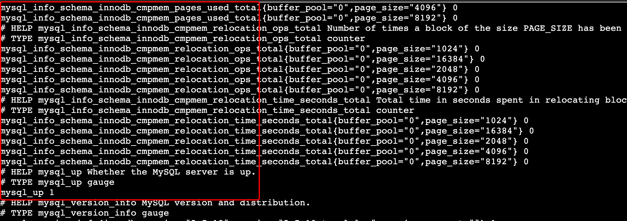 4. 在右侧的操作项下单击远程登录登录 Pod,在命令行窗口中执行以下 curl 命令对应 Exporter 暴露的地址,可以正常得到对应的 MySQL 指标。如发现未能得到对应的数据,请检查连接串是否正确,具体如下: