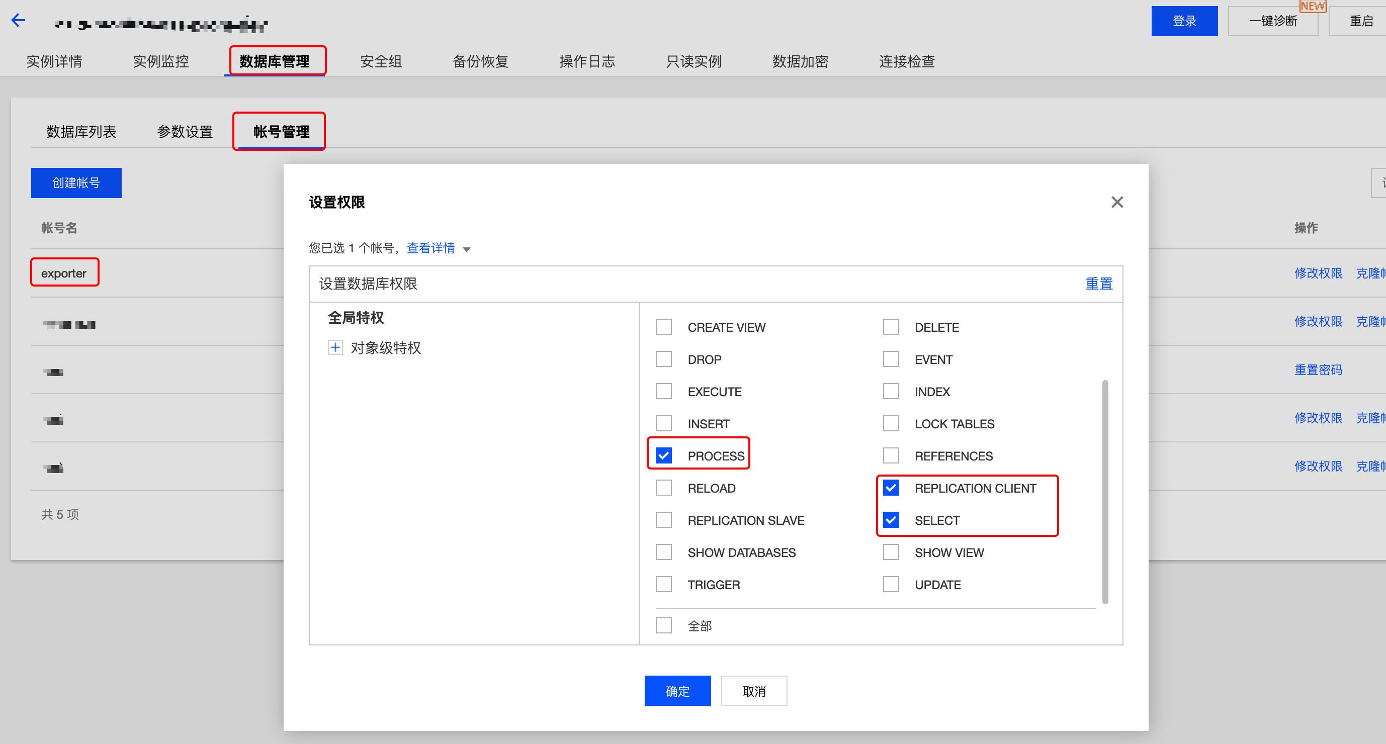 GRANT PROCESS, REPLICATION CLIENT, SELECT ON *.* TO 'exporter'@'ip';