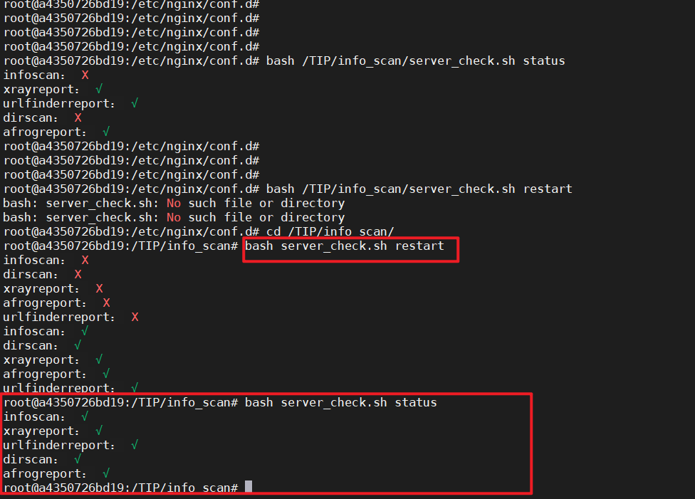 项目地址: https://github.com/huan-cdm/info_scan ``` 1. 默认账号密码:nginx/web/mysql的服务账号密码均为:admin/123456 2. 创建docker自定义网络,使容器间完成通信:docker network create info_scan_network 3. 部署mysql环境: 下载镜像:docker pull registry.cn-hangzhou.aliyuncs.com/huan666/ubuntu:0.1 启动容器:docker run -d --name mysql -it --network info_scan_network -p 3306:3306 registry.cn-hangzhou.aliyuncs.com/huan666/ubuntu:0.1 /bin/bash 进入容器:docker exec -it mysql /bin/bash 启动mysql:service mysql start 4.platform平台环境: 下载镜像:docker pull registry.cn-hangzhou.aliyuncs.com/huan666/ubuntu:0.3 启动容器:docker run -d --name platform --network info_scan_network -p 16666:16666 -p 18888:18888 -p 17777:17777 -p 15555:15555 -p 19999:19999 -it registry.cn-hangzhou.aliyuncs.com/huan666/ubuntu:0.3 /bin/bash 进入容器:docker exec -it platform /bin/bash 修改配置文件地址 修改服务器IP:/etc/nginx/conf.d/*、/TIP/info_scan/finger.sh中ip_address字段、/TIP/info_scan/static/js/common.js 一键替换脚本中默认117.72.16.222默认地址,其中172.16.0.167地址为替换后的docker宿主机地址: find /etc/nginx/conf.d/* -type f -name "*conf" -exec grep -l "117.72.16.222" {} \; |xargs sed -i 's/117.72.16.222/172.16.0.167/g' find /TIP/info_scan/ -type f \( -name "*.py" -o -name "*.sh" -o -name "*.txt" \) -exec grep -l "117.72.16.222" {} \; |xargs sed -i 's/117.72.16.222/172.16.0.167/g' find /TIP/info_scan/static/js/ -type f -exec grep -l "117.72.16.222" {} \; |xargs sed -i 's/117.72.16.222/172.16.0.167/g' 启动平台服务: bash /TIP/info_scan/server_check.sh start service nginx start 访问地址:http://ip:19999/index/ 参数配置:平台-系统配置-账号配置,点击导航栏的重启按钮 ``` 注意事项: 需要确保下面的4个服务启动正常后才能登录系统,可强制重启下服务