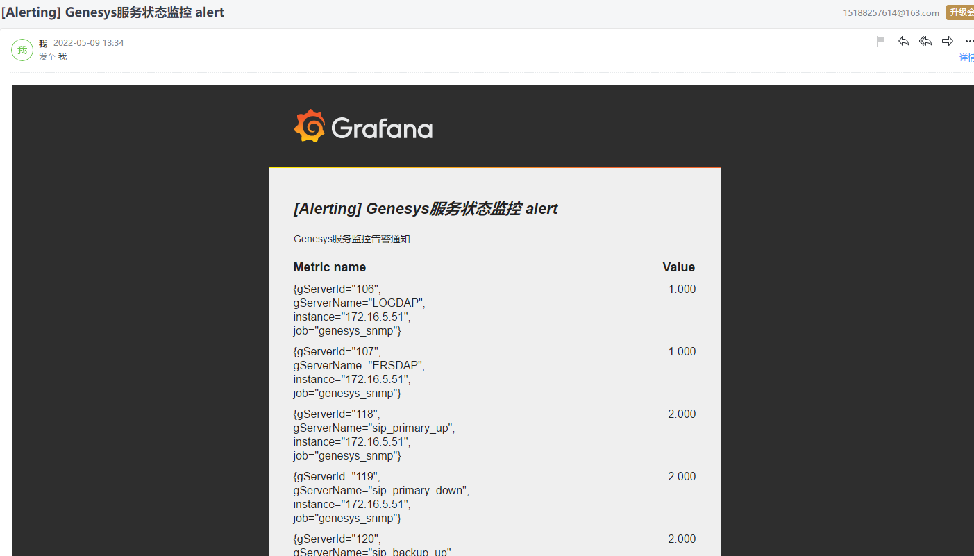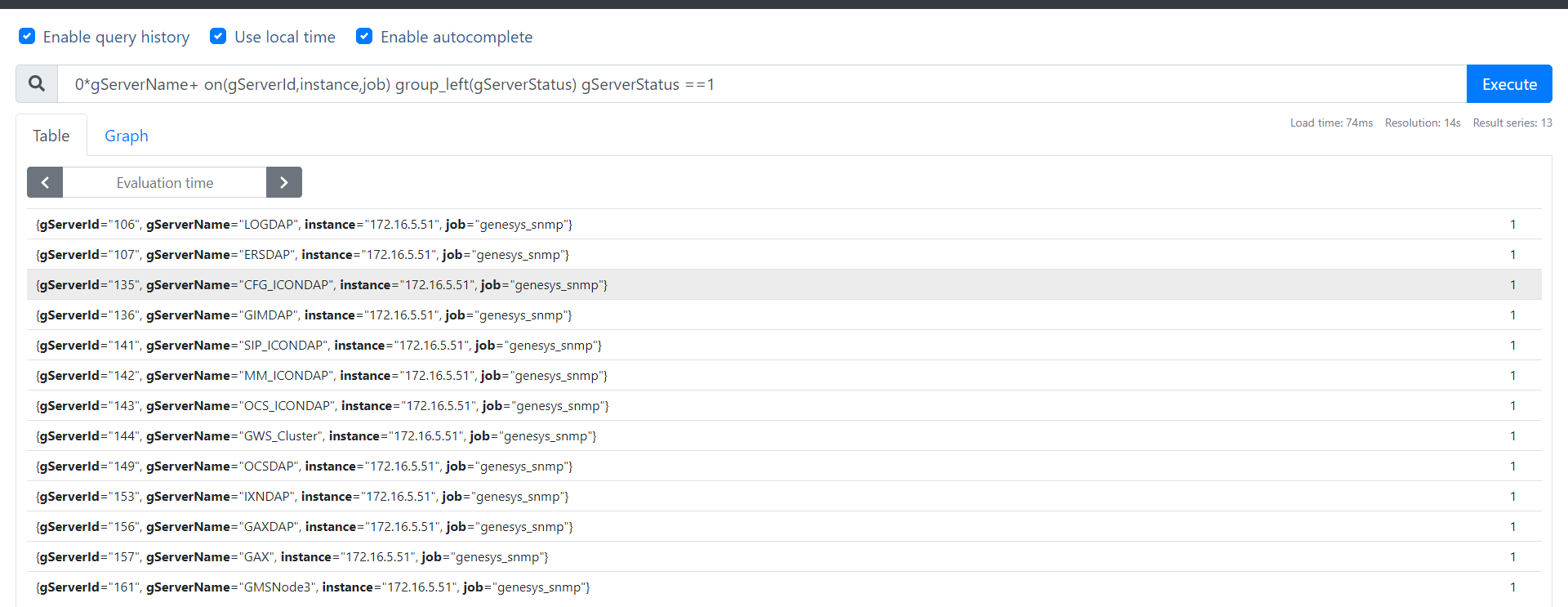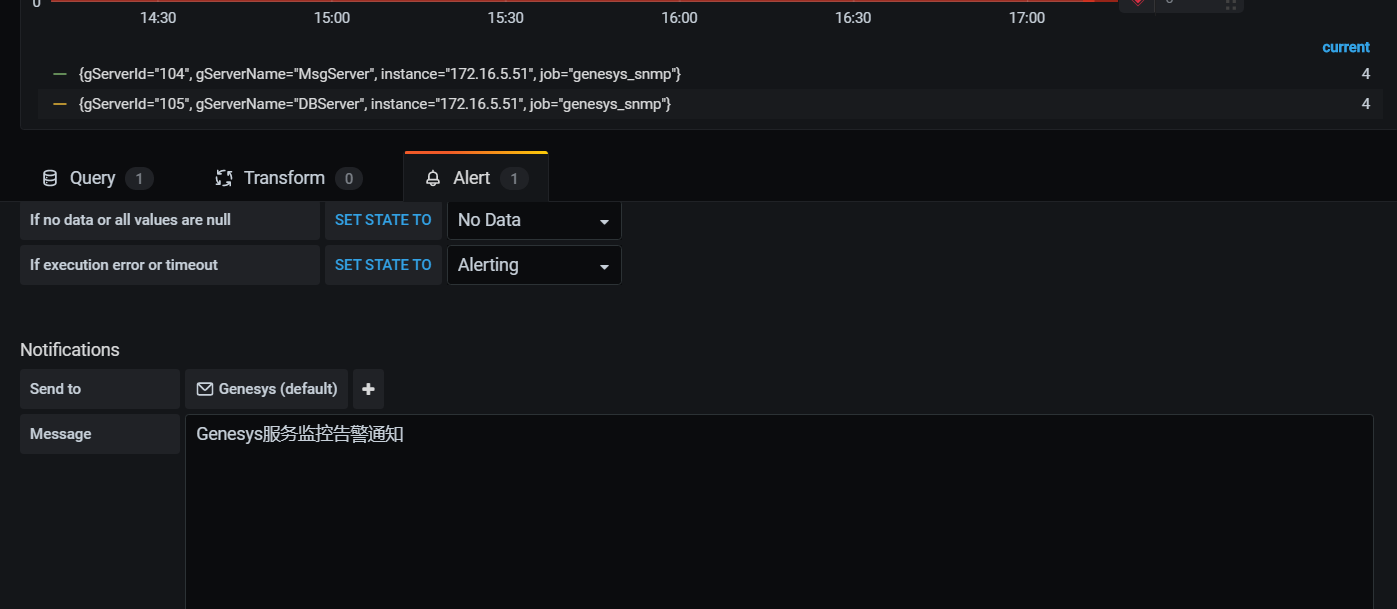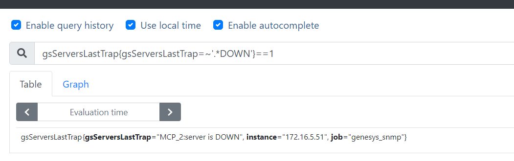 gsServersLastTrap{gsServersLastTrap="confserv:server is DOWN", instance="172.16.5.51", job="genesys_snmp"}