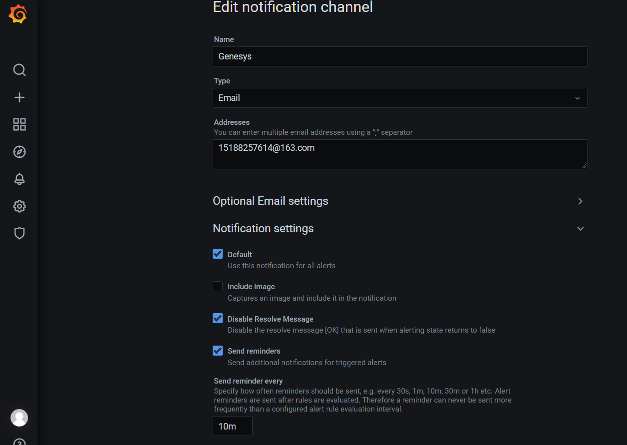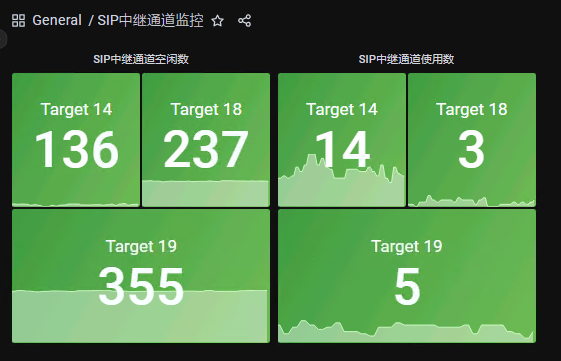 prometheus配置: 说明:14,18,19为三个不同的中继接口。当使用率大于80%后报警。 报警公式: pstn_channel_use / (pstn_channel_idle + pstn_channel_use) > 0.8 ###################### - job_name: snmp honor_timestamps: true scrape_interval: 30s scrape_timeout: 10s metrics_path: /snmp scheme: http static_configs: - targets: - "14" - "18" - "19" relabel_configs: - source_labels: [__address__] separator: ; regex: (.*) target_label: __param_target replacement: $1 action: replace - source_labels: [__param_target] separator: ; regex: (.*) target_label: instance replacement: $1 action: replace - separator: ; regex: (.*) target_label: __address__ replacement: 192.168.185.85:9116 action: replace ################################## |