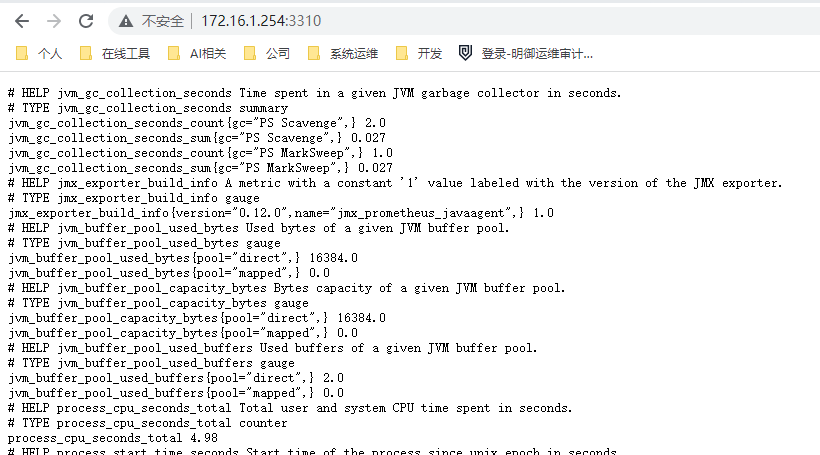 cd /usr/local mkdir jvm_exporter vim simple-config.yml --- wercaseOutputLabelNames: true lowercaseOutputName: true whitelistObjectNames: ["java.lang:type=OperatingSystem"] rules: - pattern: 'java.lang<type=OperatingSystem><>((?!process_cpu_time)\w+):' name: os_$1 type: GAUGE attrNameSnakeCase: true 或者使用下面配置 -- 比如我有一个rms的java应用,启动方式为: java -jar /data/rms/RMS.jar 使用JMX Exporter插件收集数据,需要改成这样: java -javaagent:/usr/local/jmx_exporter/jmx_prometheus_javaagent-0.12.0.jar=3010:/usr/local/jmx_exporter/simple-config.yml -jar /data/rms/RMS.jar 注意:3010是代理端口,可以随意指定。 或者下面已遵义公积金ivr流程为例 java -javaagent:/usr/local/jvm_exporter/jmx_prometheus_javaagent-0.12.0.jar=3310:/usr/local/jvm_exporter/simple-config.yml -jar ./laihu-ivr-zygjj.jar